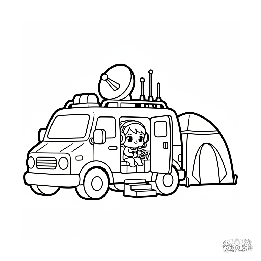 Simple coloring page for toddlers 2-3: a cute mobile command center van with a satellite dish, parked next to a headquarters tent.