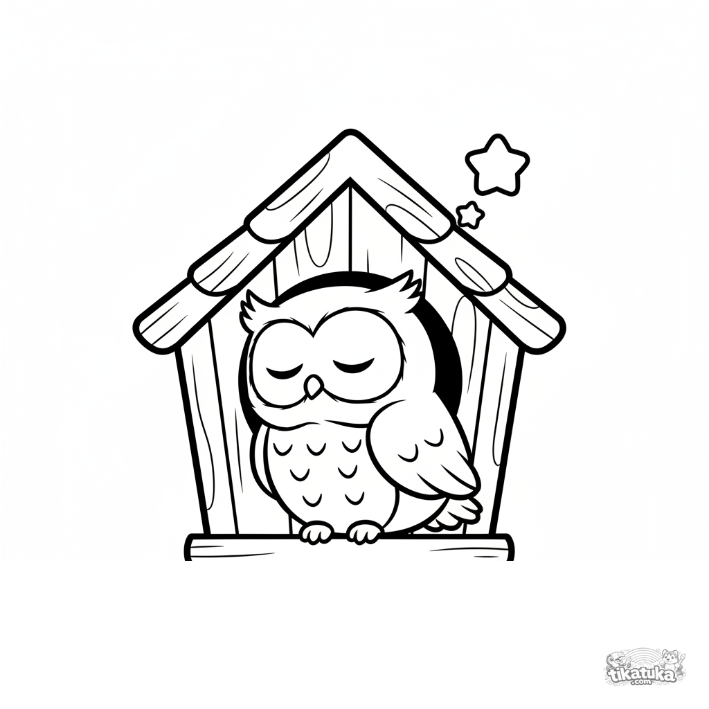 Simple coloring page for toddlers 2-3: an adorable baby owl fast asleep in a cozy wooden birdhouse. Large shapes and clear outlines are perfect for first crayons.
