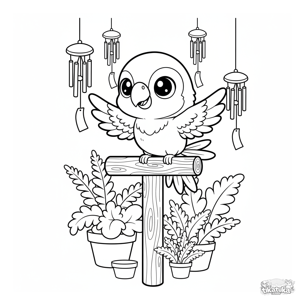Coloring page for kids 4-6: a cute chibi parrot learns to fly from a garden perch. Big head, tiny wings, determined expression.