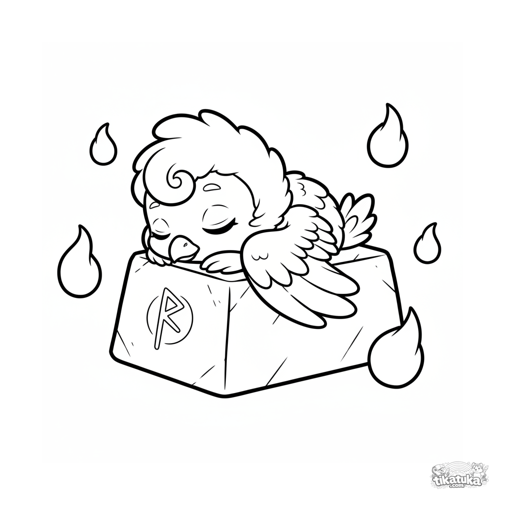 Simple coloring page for toddlers 2-3: a cute chibi phoenix naps sweetly on an ancient rune stone. Large, simple shapes perfect for first crayons.