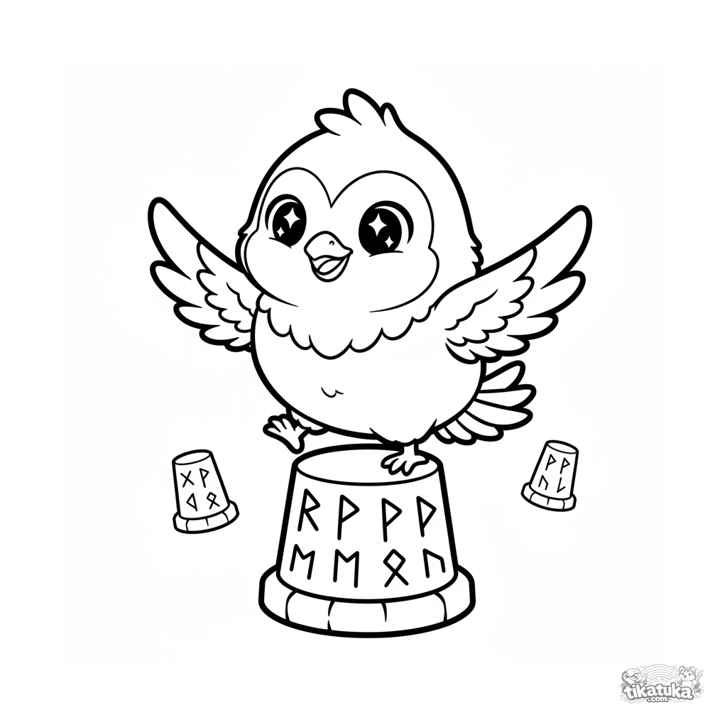 Coloring page for toddlers 2-3: a cute chibi phoenix stands on a rune stone. Huge simple shapes, wide areas to color, very few details.
