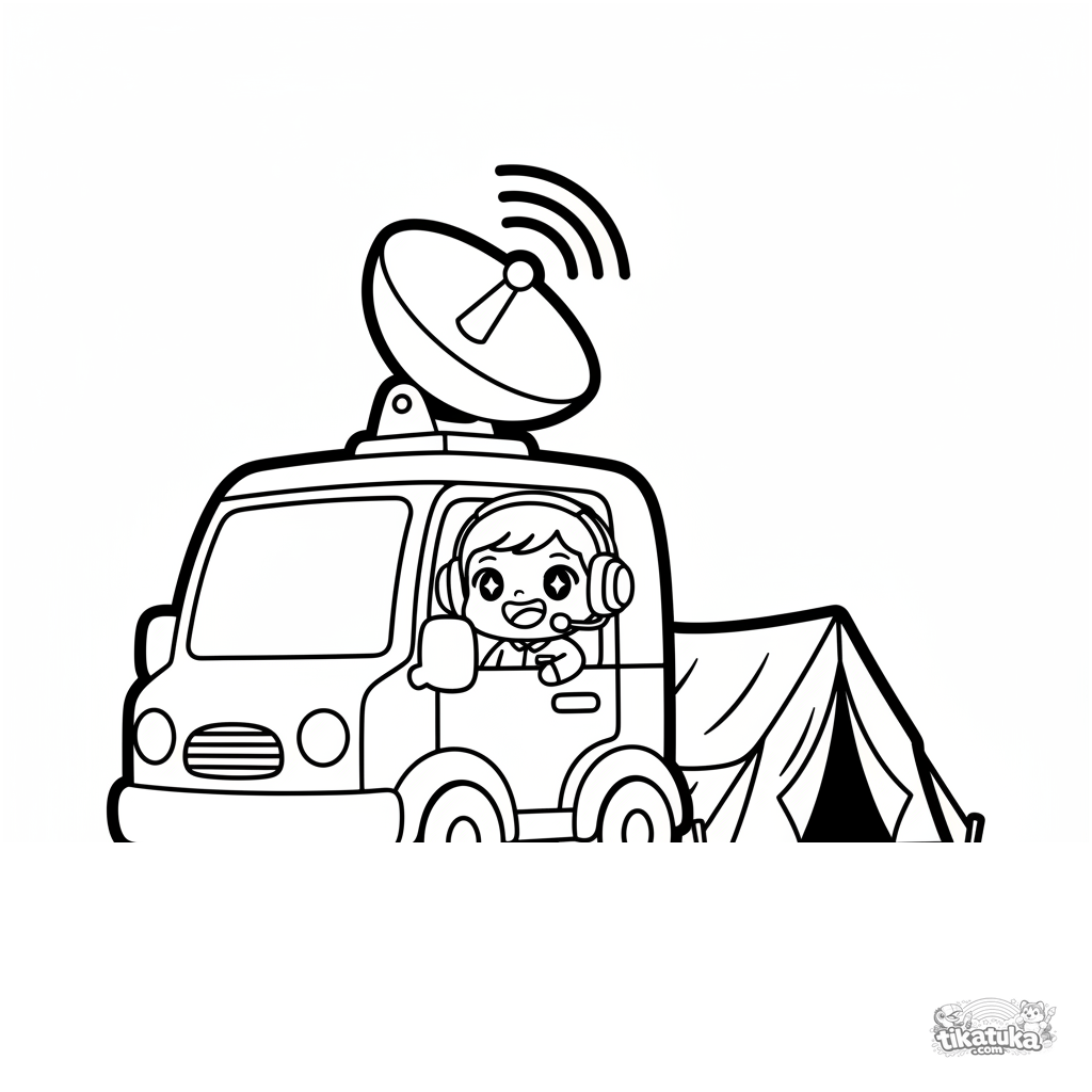 Simple coloring page for toddlers 2-3: a cute radio truck with a big antenna and a smiling soldier in the window near the command tent. Large shapes.