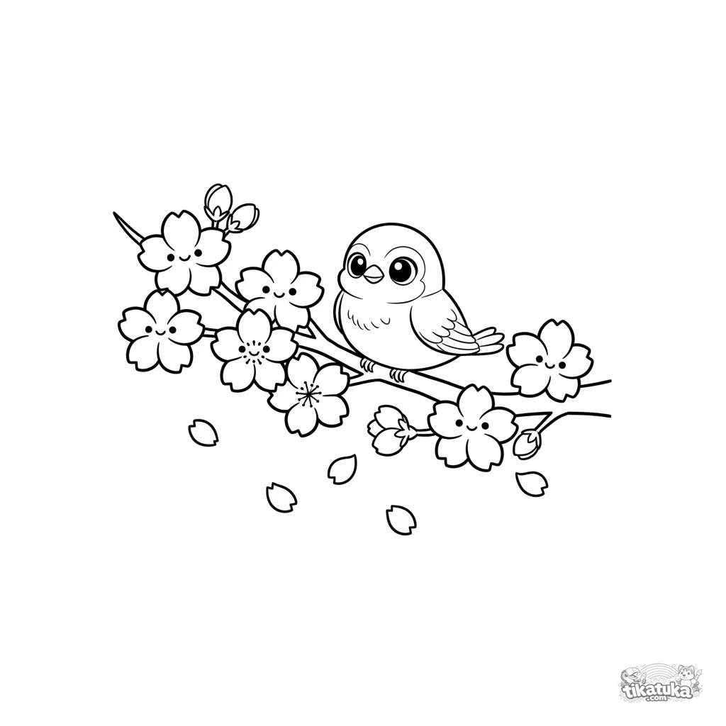 Simple coloring page for toddlers 2-3: a sakura branch in cute chibi style with smiling flowers and a little bird. Large shapes, falling petals.
