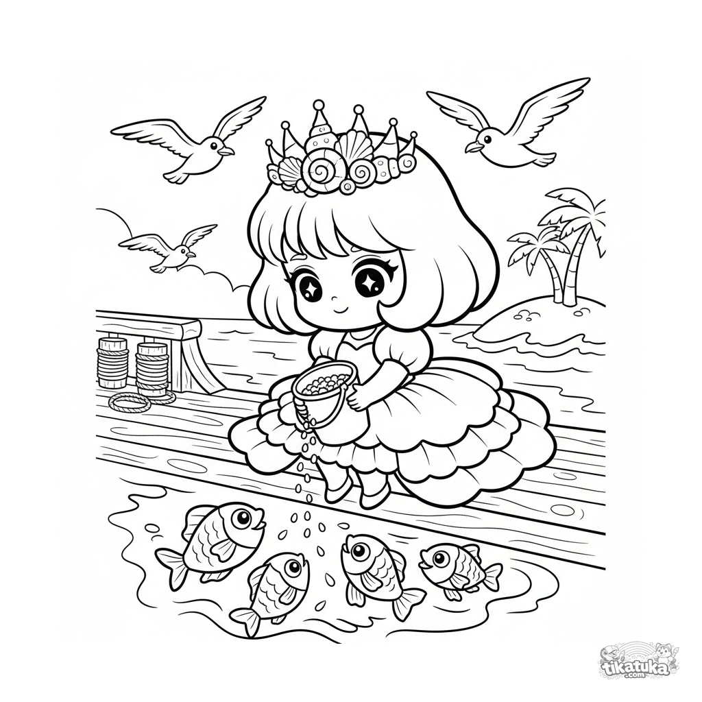 Fun coloring page for kids 4-6: a cute sea princess in chibi style feeds fish from a ship deck. Bright and simple shapes.
