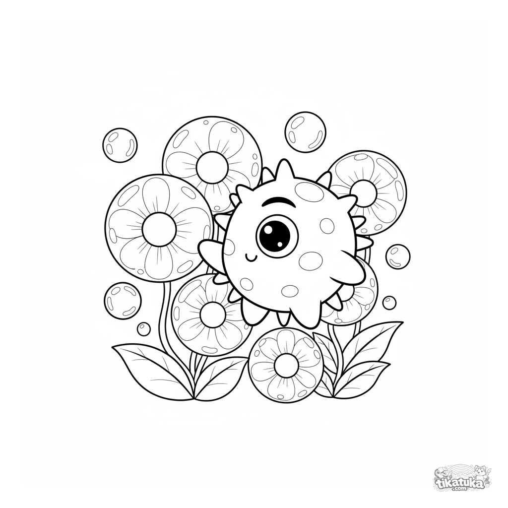 Kids coloring page: a star-shaped microbe with one big eye floats among bubble flowers in a garden. Chibi style, cute expression, suitable for ages 4-6.