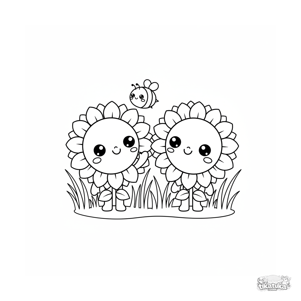 Coloring page for kids 4-6: cute chibi-style sunflowers in a field with a bee. Funny proportions, simple details, a friendly scene.