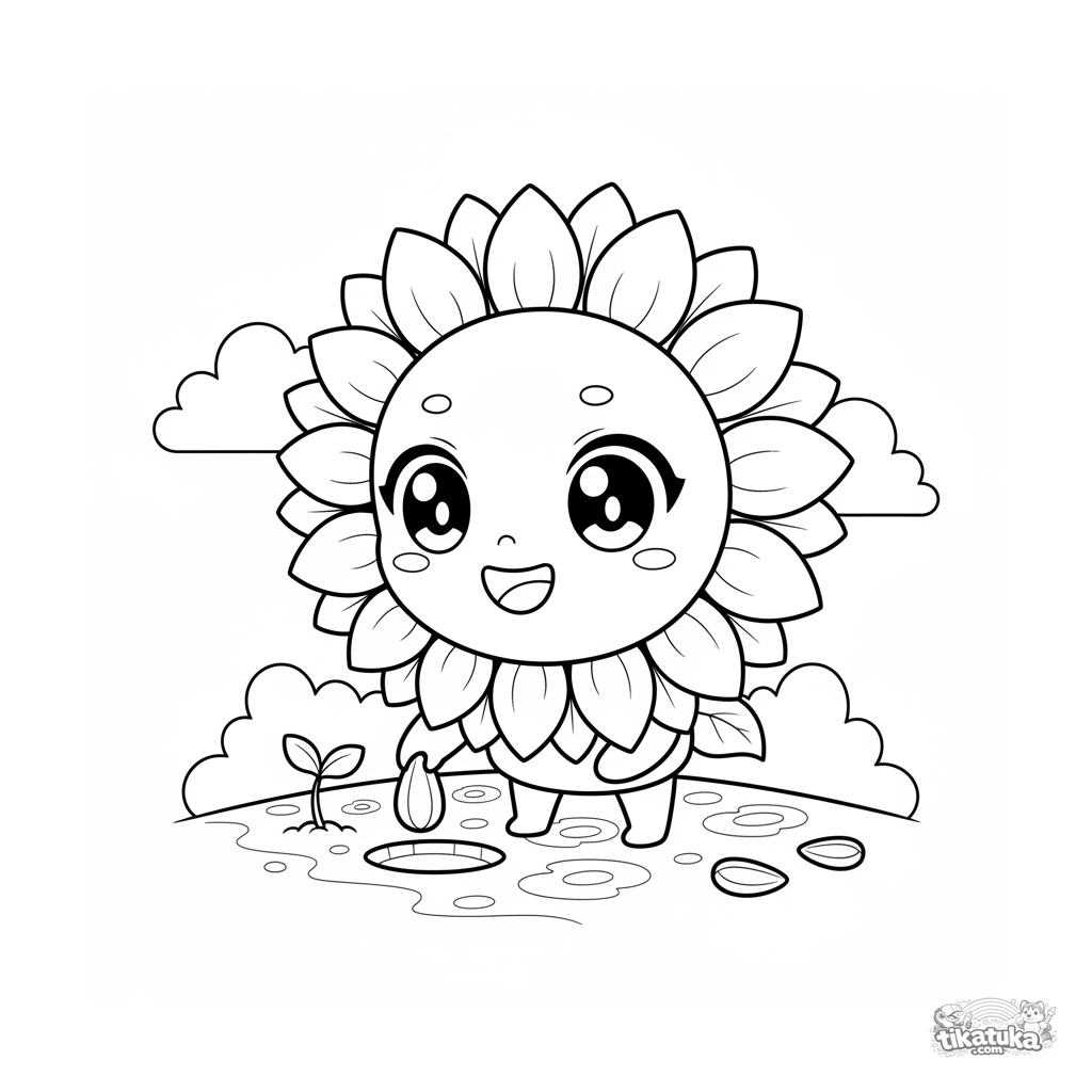 Coloring page for kids 4-6: a cute sunflower in chibi style planting a seed in the soil. Big head, small body, expressive eyes, simple background.