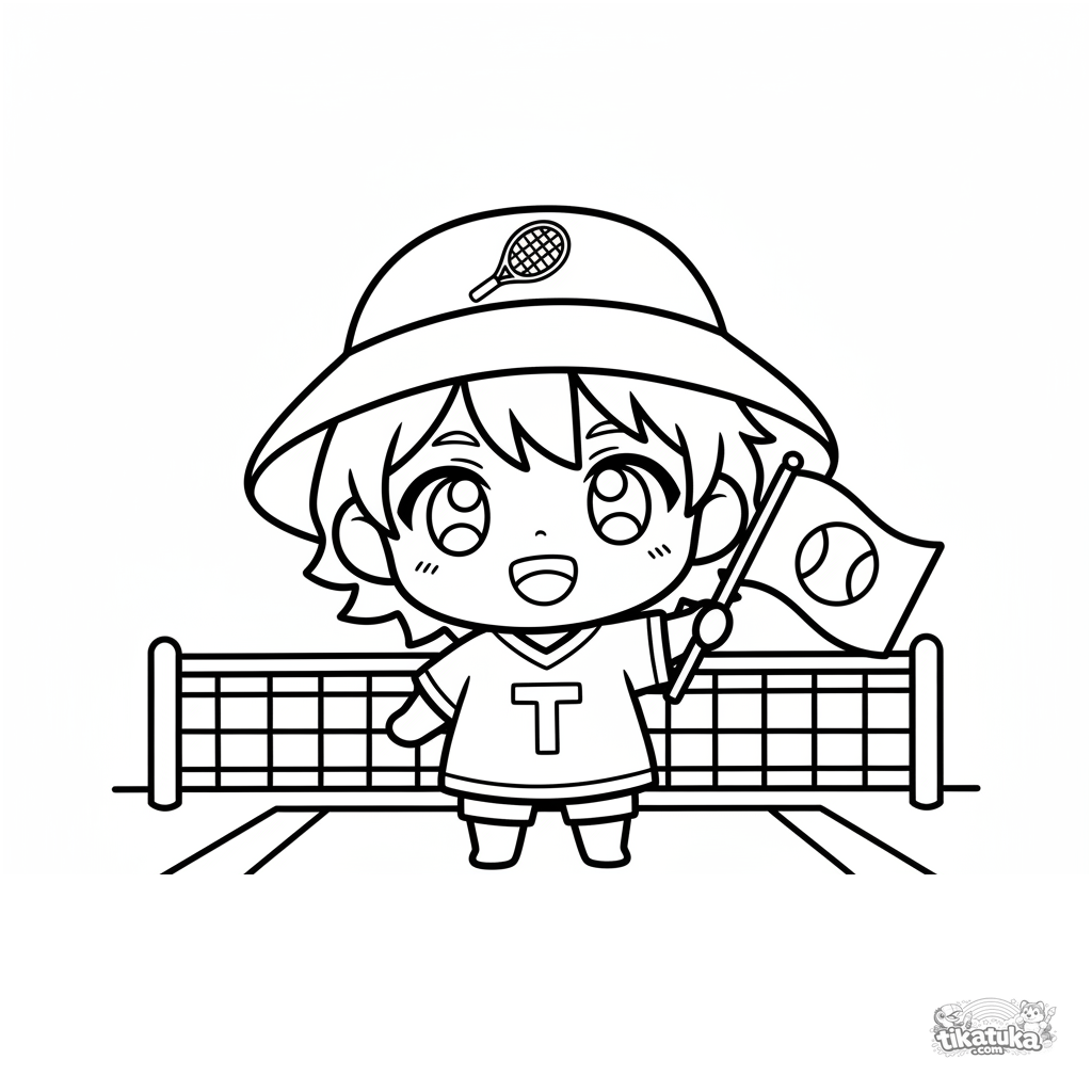 Simple toddler coloring page 2-3: a cute chibi fan waving a flag by a tennis court. Huge head, simple shapes, very few lines.