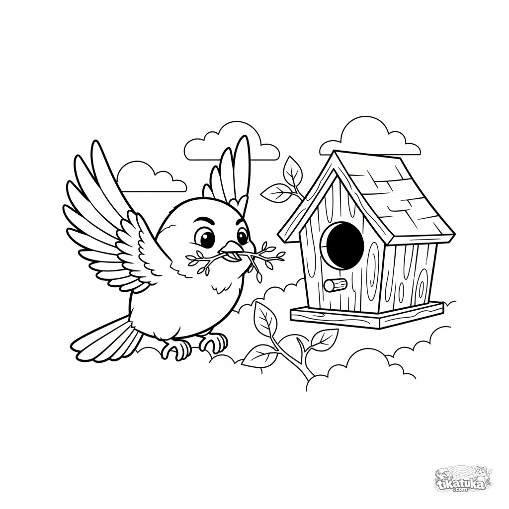 Coloring page for tweens 7-9: a chickadee flying towards a birdhouse with twigs for its nest. A dynamic nest-building scene in Disney style.