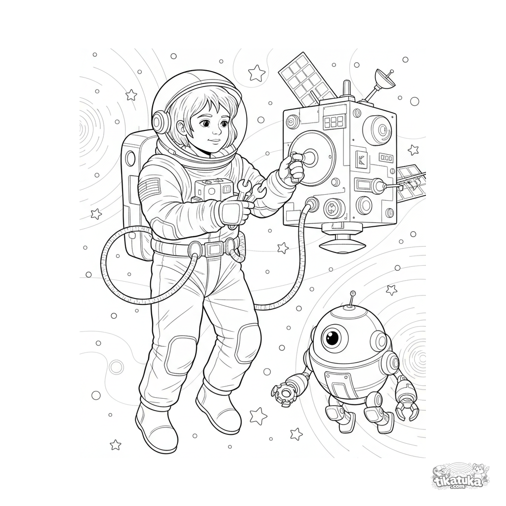 Coloring page for older kids 10-12: a child astronaut performs a spacewalk to repair a satellite, assisted by a small robot friend, with stars in the background.