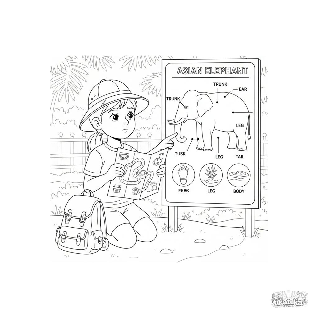 Detailed coloring page for ages 10-12: a child compares a zoo map to an informational board about Asian elephant anatomy. Educational scene about exploration and learning.