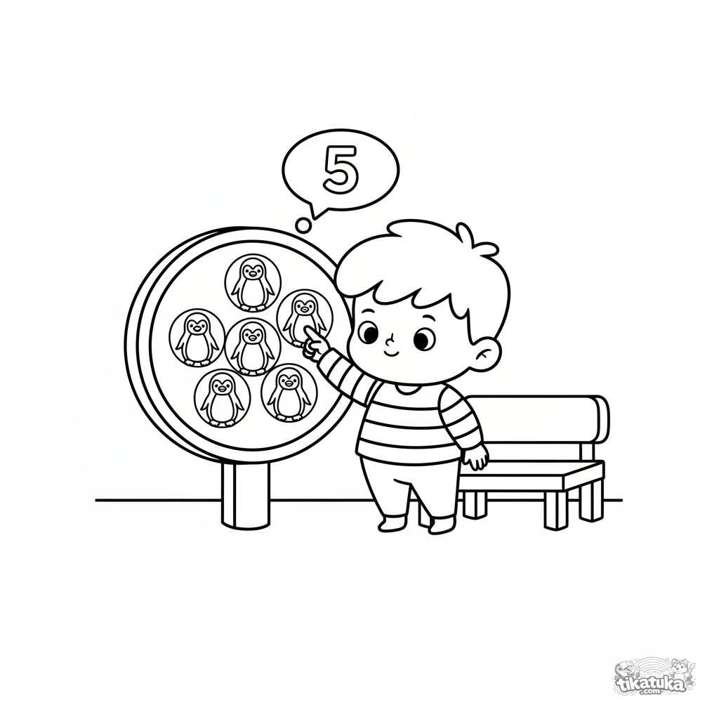 Coloring page for toddlers aged 2-3. A child counts penguins on a large zoo map. Very simple shapes, large coloring areas, learning to count.