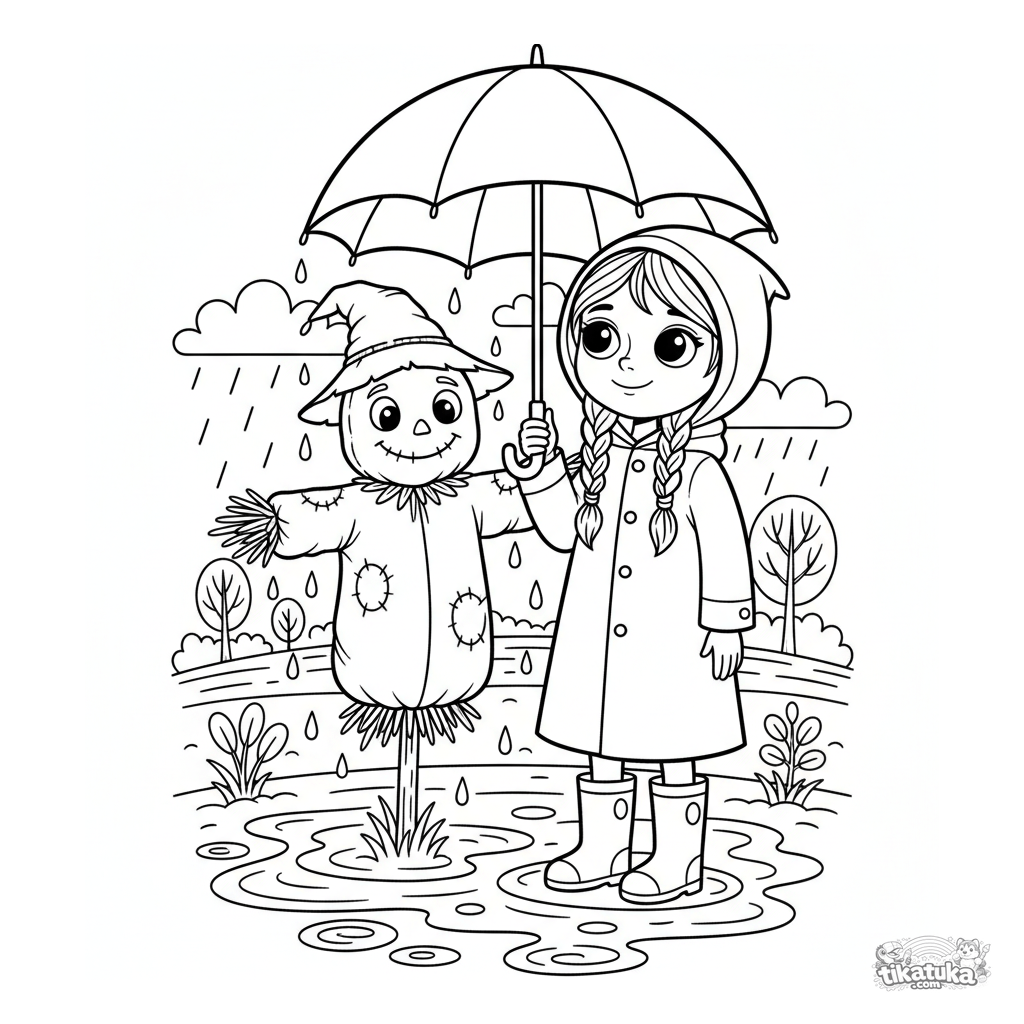 Coloring page for kids 4-6 years old: a child in rubber boots shares an umbrella with a scarecrow in an autumn field in the rain. Folk style, clear shapes.