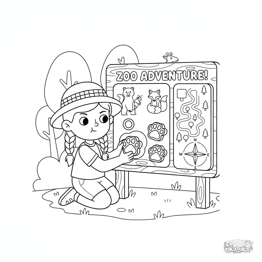 Coloring page for kids 4-6: a child matches wooden animal track cutouts to their silhouettes on a large interactive trail sign at the zoo. Educational game scene.