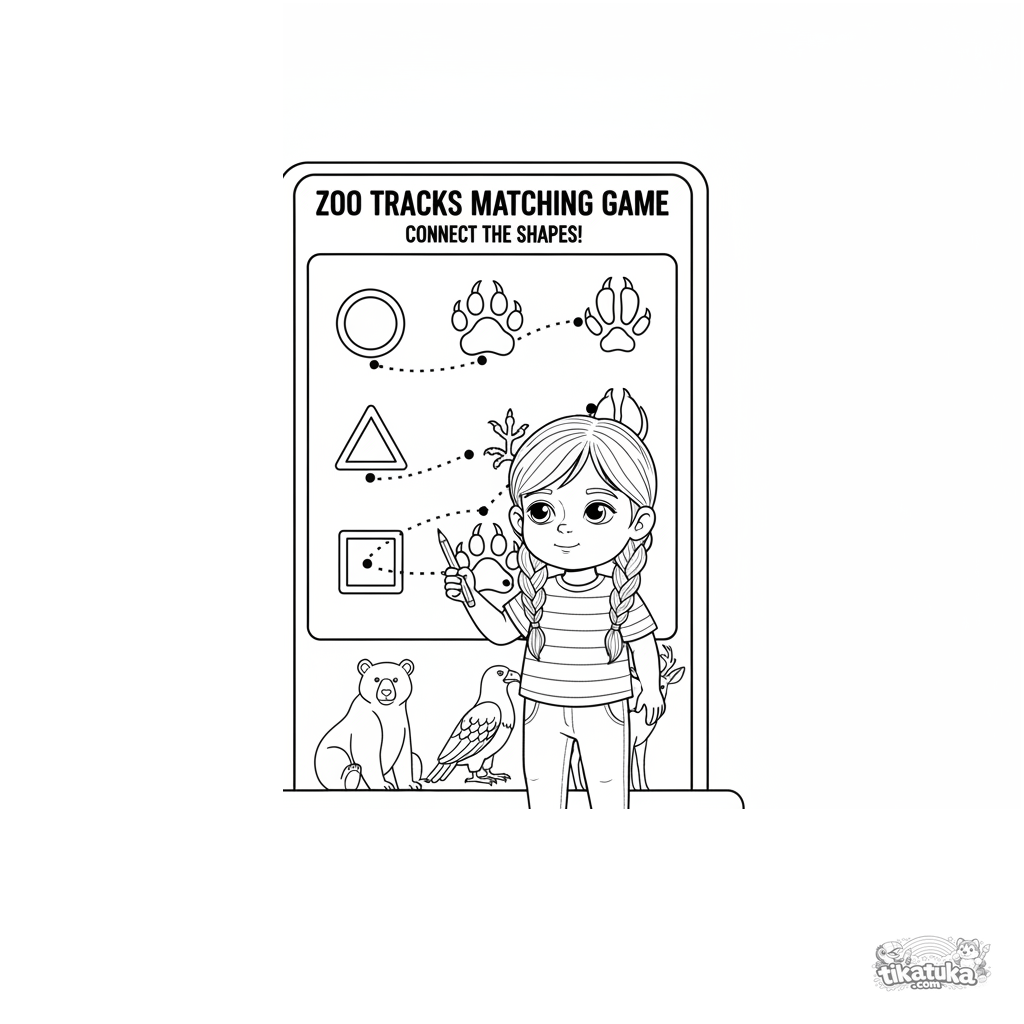 Coloring page for kids 4-6: a child at a zoo board plays a matching game, connecting geometric shapes to different animal footprints. Educational scene for learning shapes and nature.