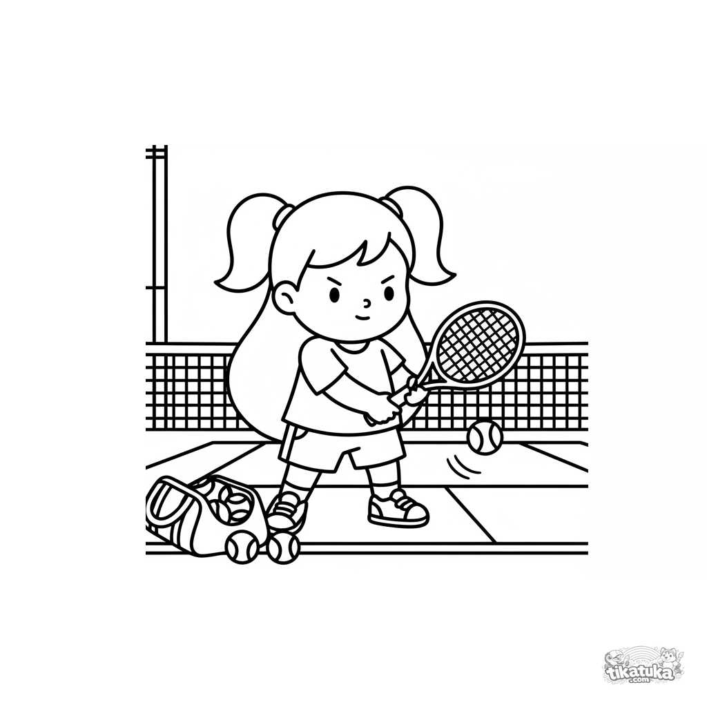 Coloring page for kids 4-6: a child diligently practices their swing against a tennis backboard on the court. Simple shapes, ball, racket, bag.