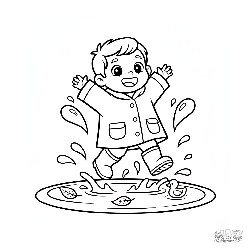 Toddler coloring page (ages 2-3): a joyful child in a raincoat jumps in an autumn puddle. Simple large shapes with wide margins for easy coloring.