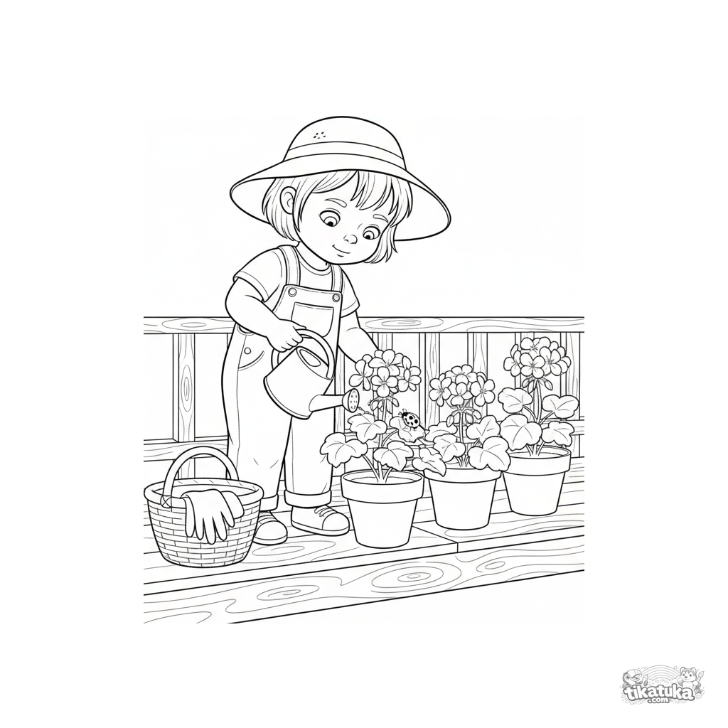 Coloring page for tweens 7-9: a child in overalls watering potted plants on a cottage veranda. Detailed cozy scene with watering can and basket.
