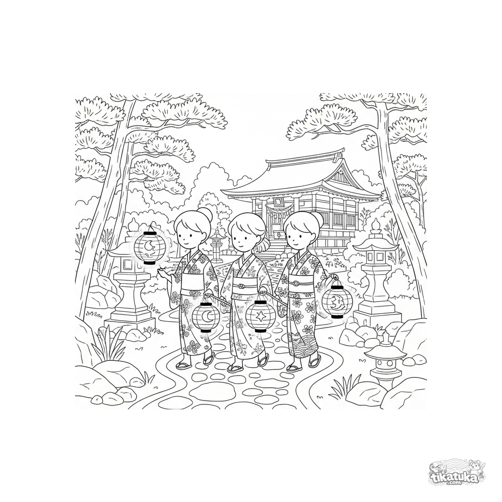Coloring page for older kids: a group of children in yukata carry paper lanterns on a path to a shrine. A quiet nighttime festival procession.