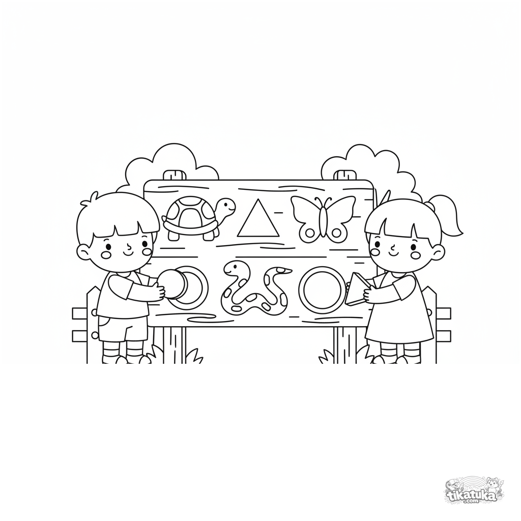 Coloring page for kids 7-9: children matching geometric shapes to animal silhouettes on an interactive sign at the zoo. Learning through play.