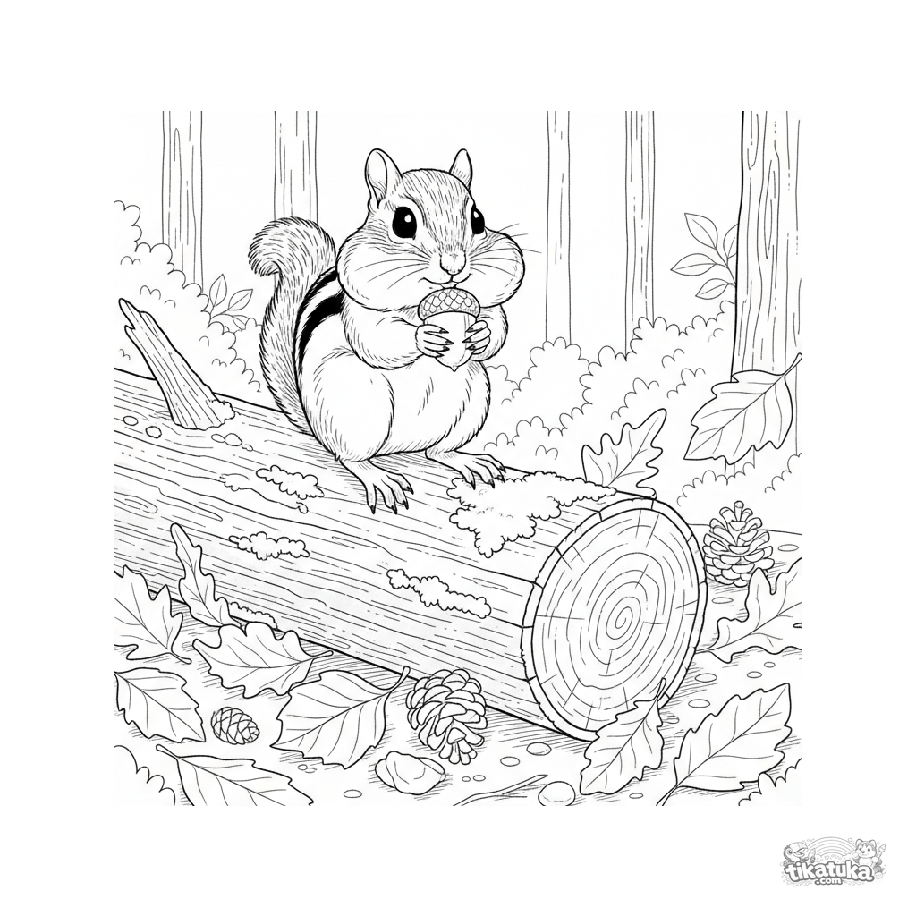 Coloring page of a chipmunk in an autumn forest. For kids 4-6. The small animal sits on a mossy log holding an acorn among fallen leaves.