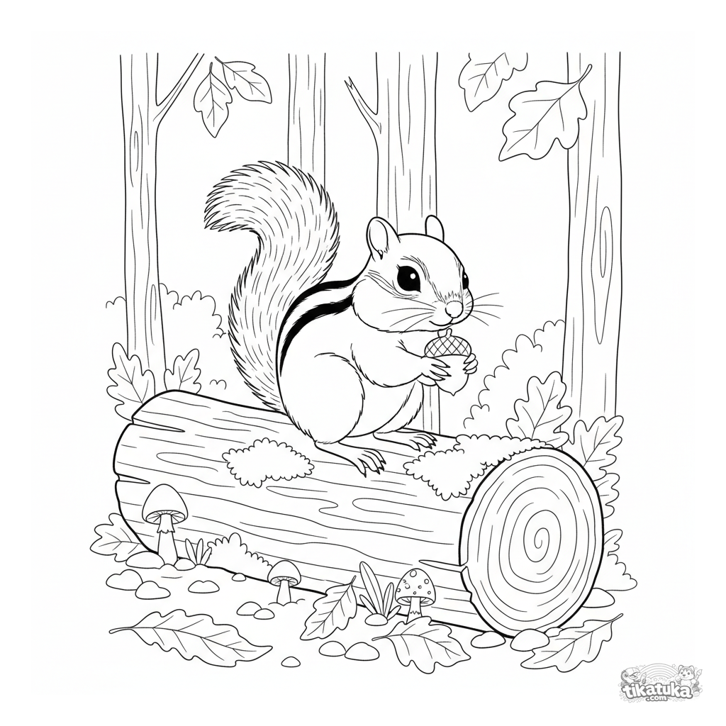 Coloring page of a chipmunk on a mossy log in an autumn forest. For kids aged 4-6. A detailed yet clear scene with natural elements.