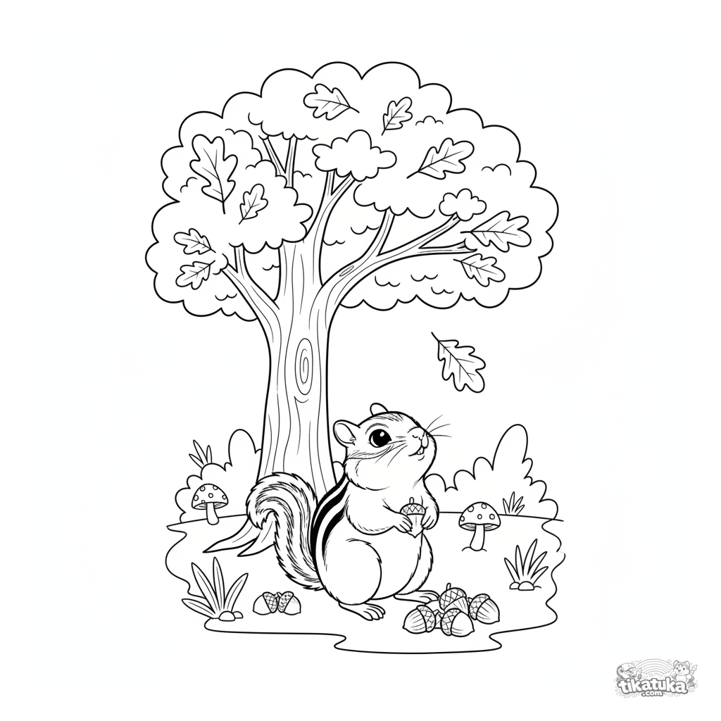 Coloring page of a chipmunk in an autumn forest. For kids 4-6 years old. The chipmunk with full cheeks looks curiously at a falling leaf.