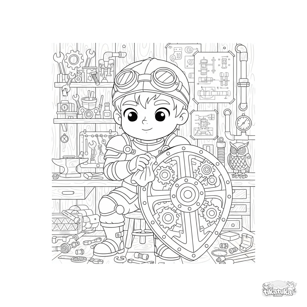 Detailed coloring page of a steampunk clockwork knight boy polishing his gear shield in a workshop. For older kids 7-12, featuring intricate mechanical designs.