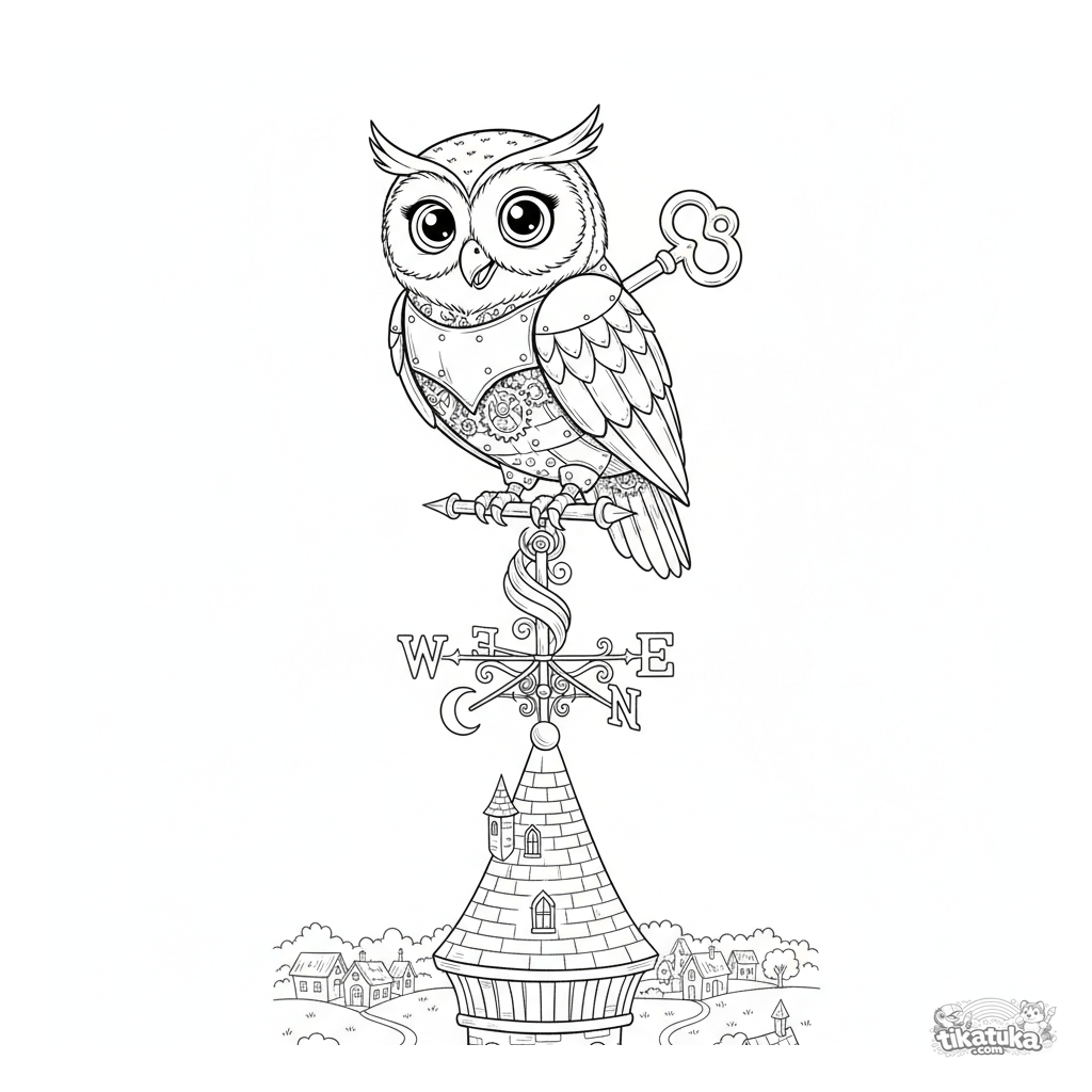 Coloring page for tweens 7-9: a detailed clockwork owl with visible gears perches on an ornate weathervane atop a tall wizard's tower.