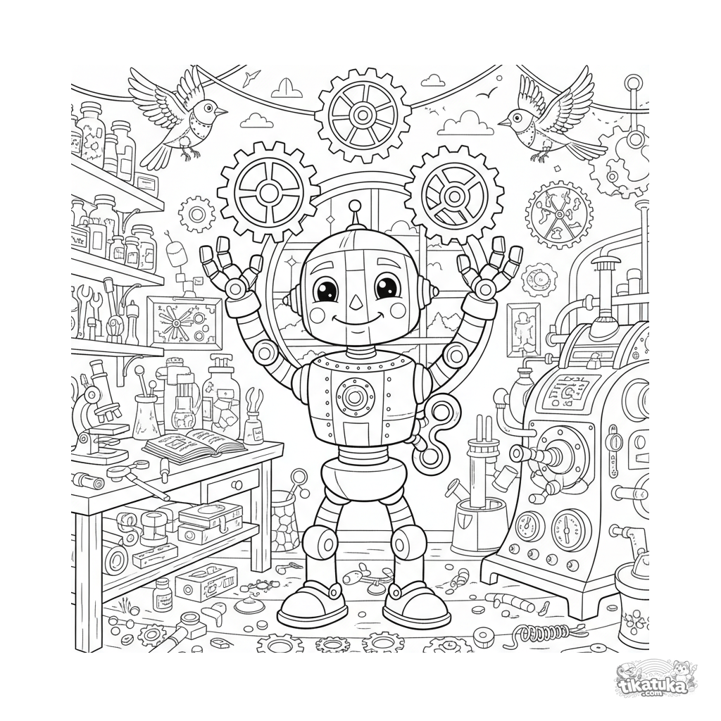 Coloring page of a clockwork robot juggling gears in an inventor's cluttered workshop. For older kids 7-12. A detailed scene with a mechanical friend, full of interesting elements to color.