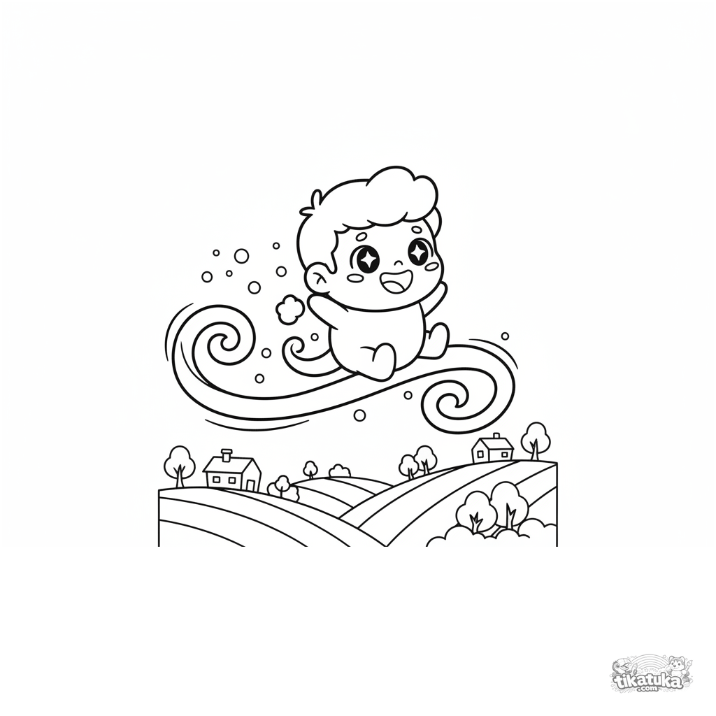 Coloring page for kids 4-6: a happy, fluffy cloud sprite rides a breeze high in the sky. A bright and joyful fantasy scene.
