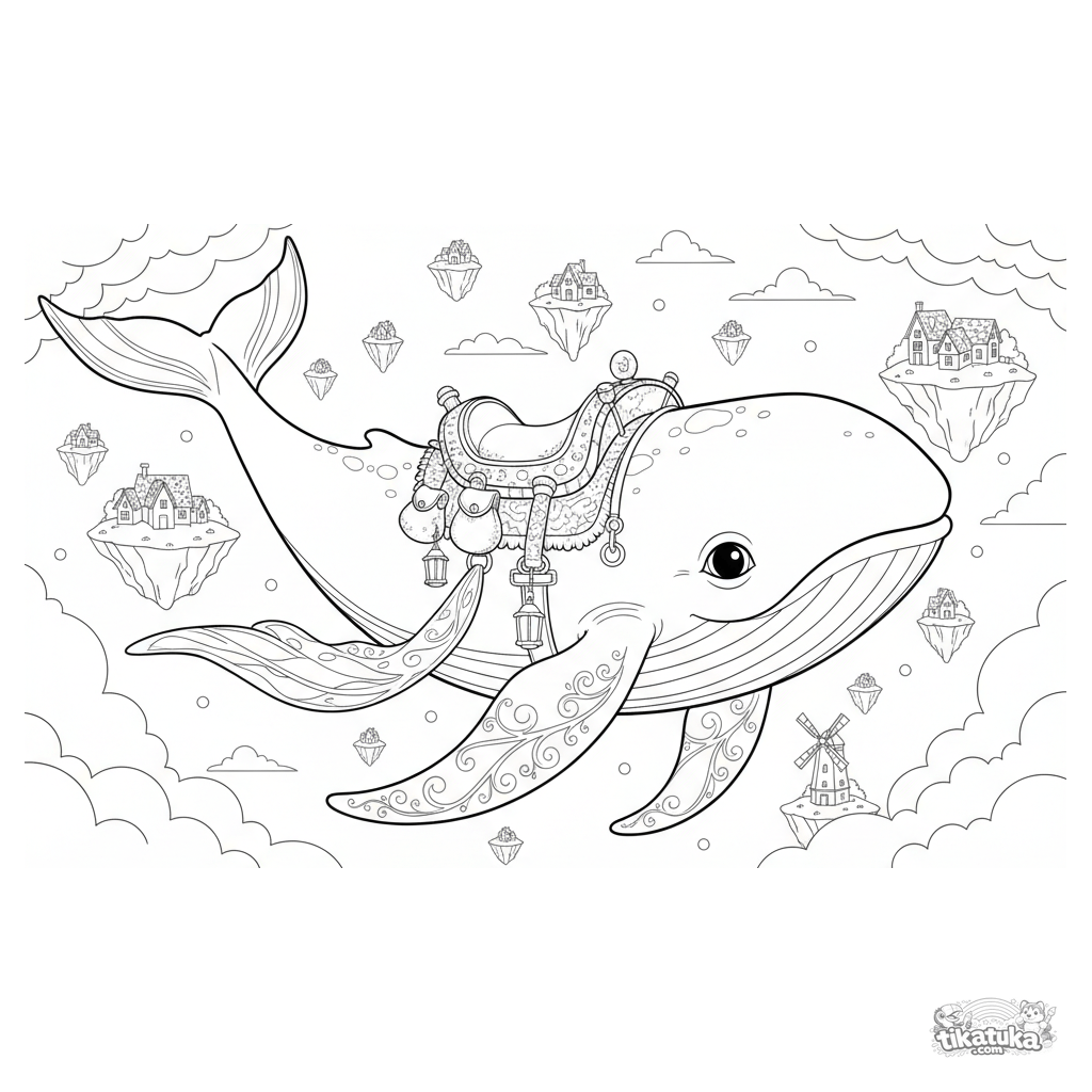 Coloring page for ages 10-12: a majestic cloud whale swims above floating islands. A detailed fantasy scene for experienced colorists.