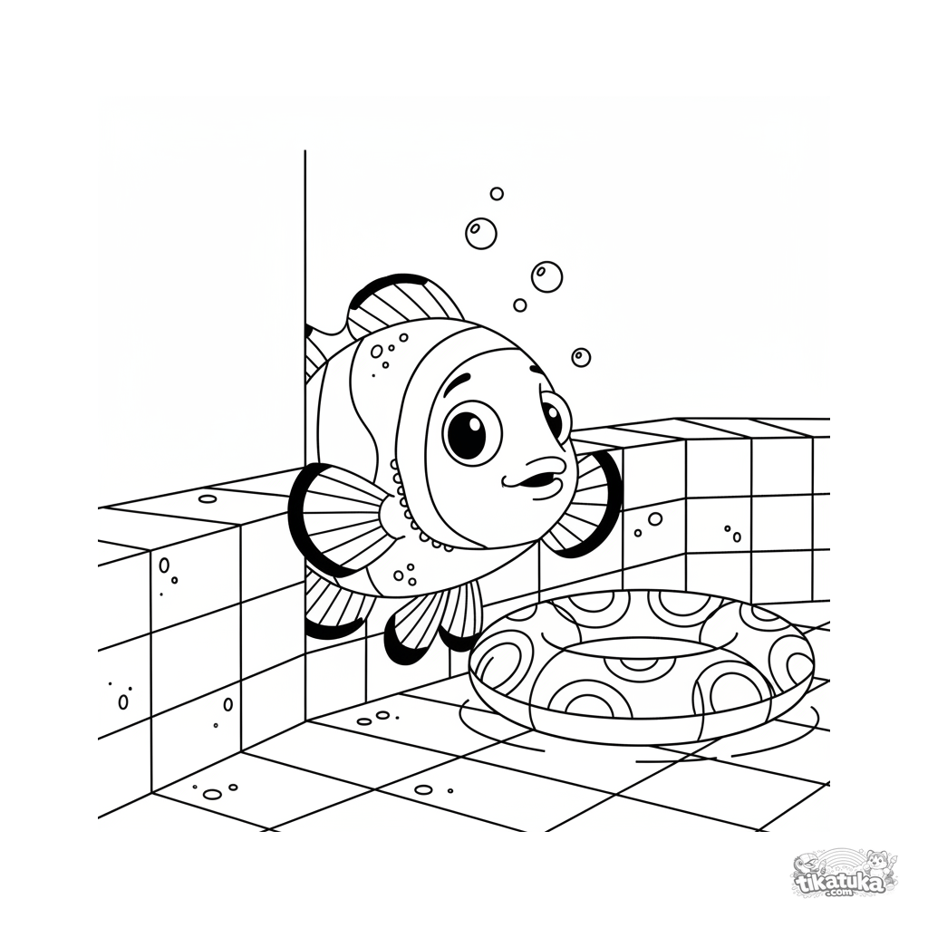 Detailed realistic coloring page for kids 10-12: a striped clownfish peeks out from a pool corner next to an inflatable ring. Anatomically accurate lines and scale textures.