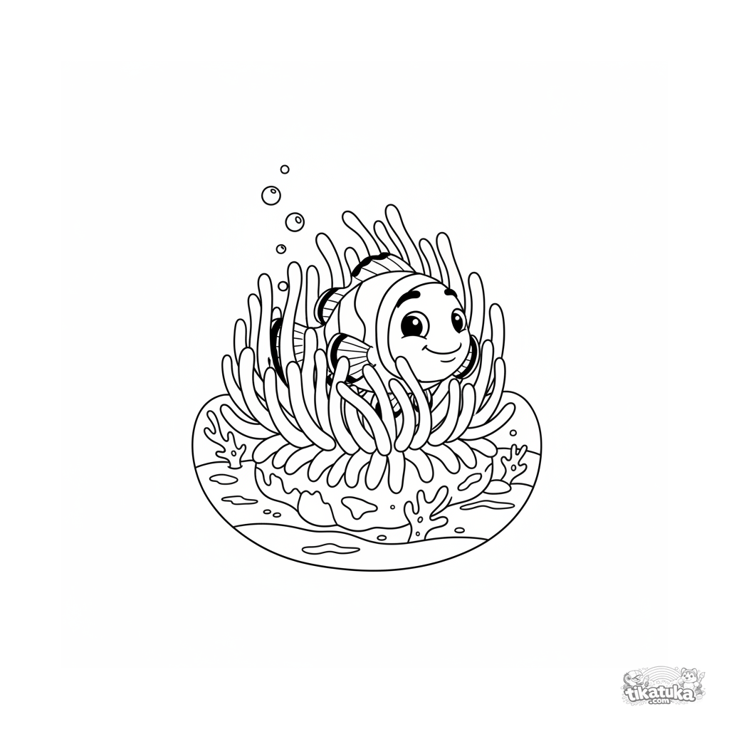 Fun 90s-style coloring page: clownfish peeking from an anemone on a sunny coral reef. For kids 4-6 years old. Bold, expressive shapes.