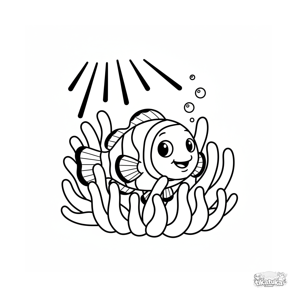 Fun coloring page of a clownfish peeking from an anemone in the sunny shallows. For kids 4-6 years old, with clear outlines and wide margins.