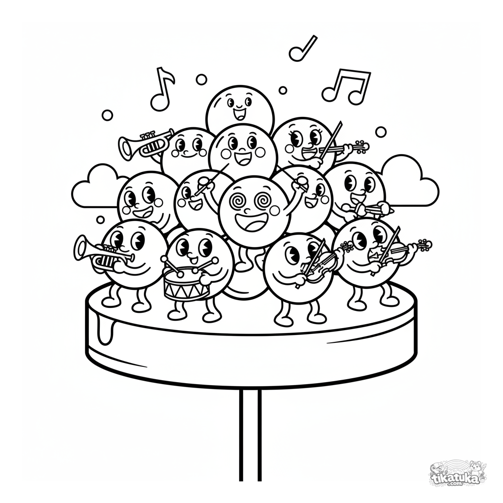 Fun coloring page for kids 4-6: a cluster microbe conducts an orchestra on a lollipop. A bright cartoon image in a 1930s retro style.