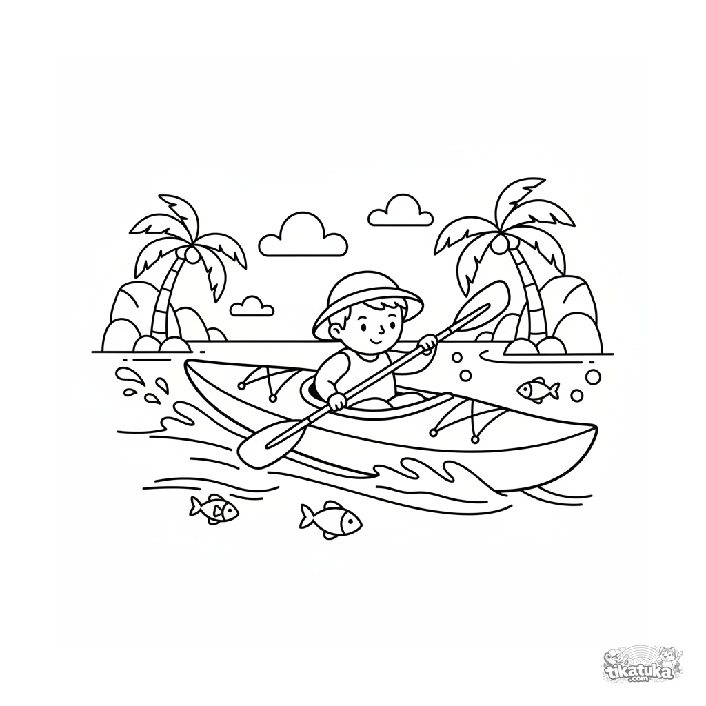 Coloring page for kids 4-6: a fast kayak races across a tropical bay. Bright, clean shapes and a dynamic pose for fun coloring.