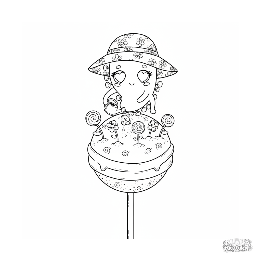 Detailed coloring page for ages 10-12: a comma-shaped bacterium tends to a sweet garden growing right on the surface of a giant lollipop. Children's anime style.