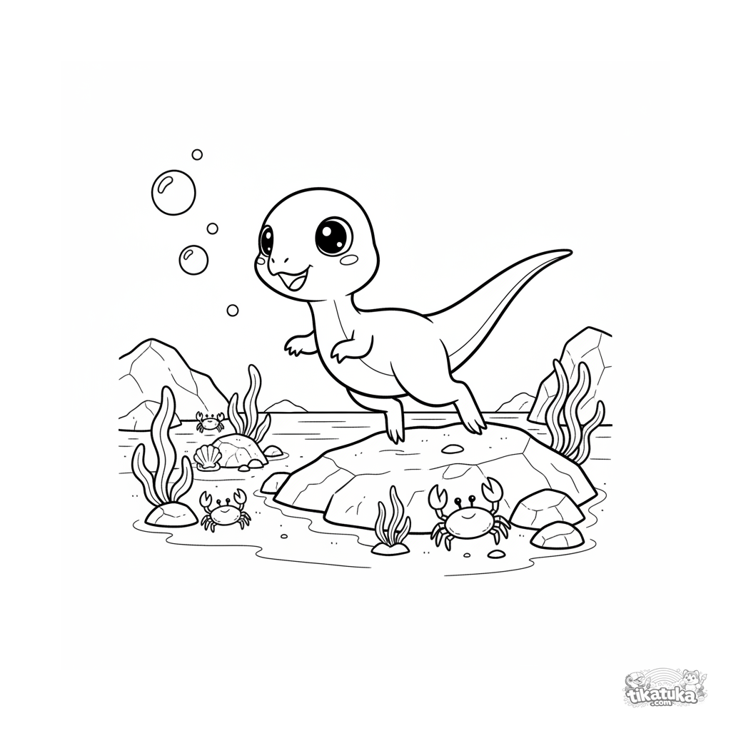 Fun coloring page for ages 4-6: a tiny compsognathus dinosaur happily chasing air bubbles among rocks in the shallow tide of an ancient beach.