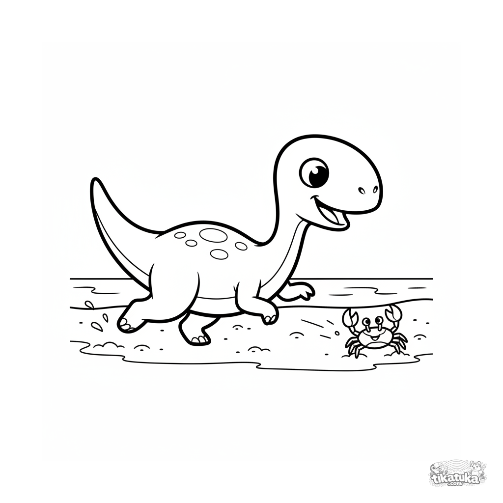 Simple toddler coloring page ages 2-3: a tiny compsognathus runs across the wet sand of an ancient beach, chasing a little crab. Clear outlines.