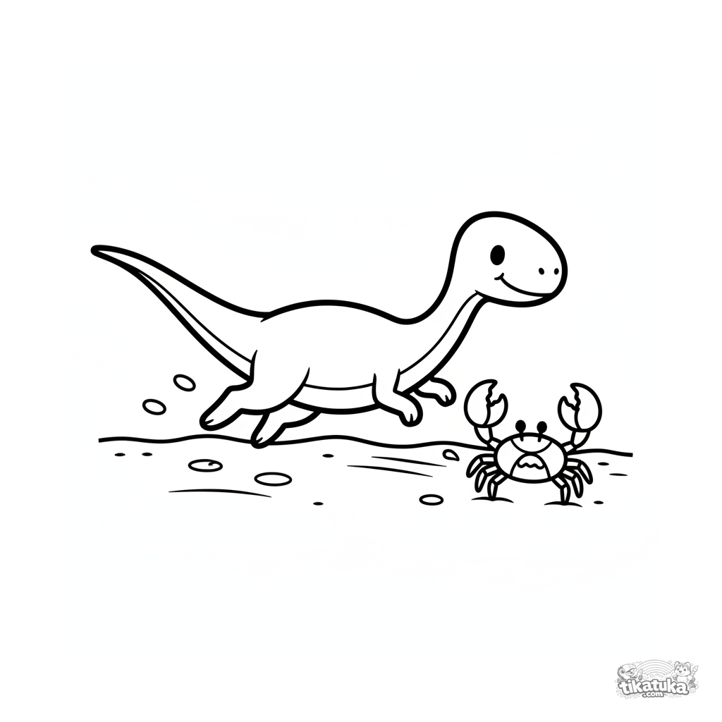 Simple coloring page for toddlers 2-3: a small compsognathus dinosaur running after a crab on the sand of an ancient beach. Clear outline, few lines.