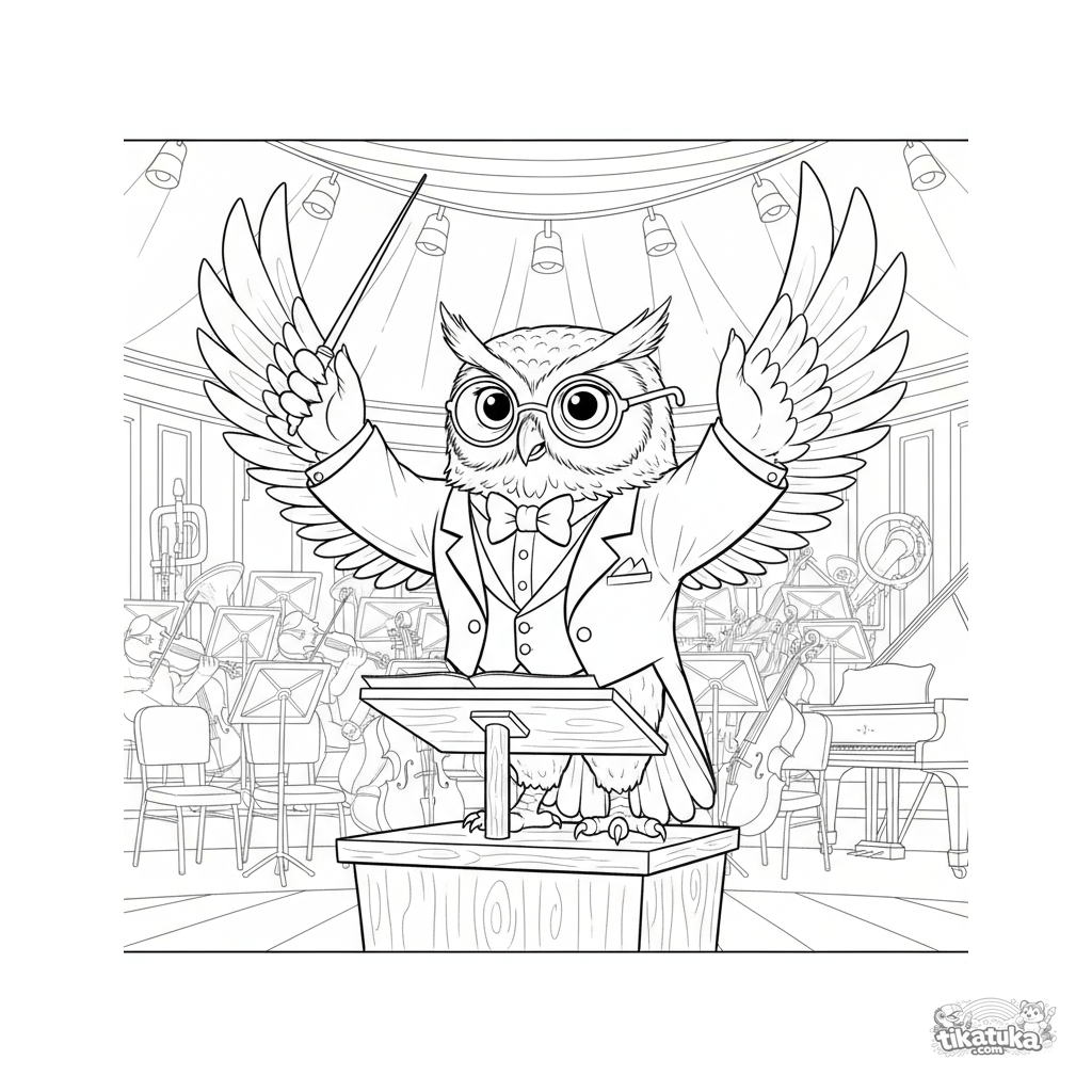 Detailed coloring page for older kids 10-12: a wise owl in a tailcoat conducts an orchestra from the podium on a grand concert hall stage.