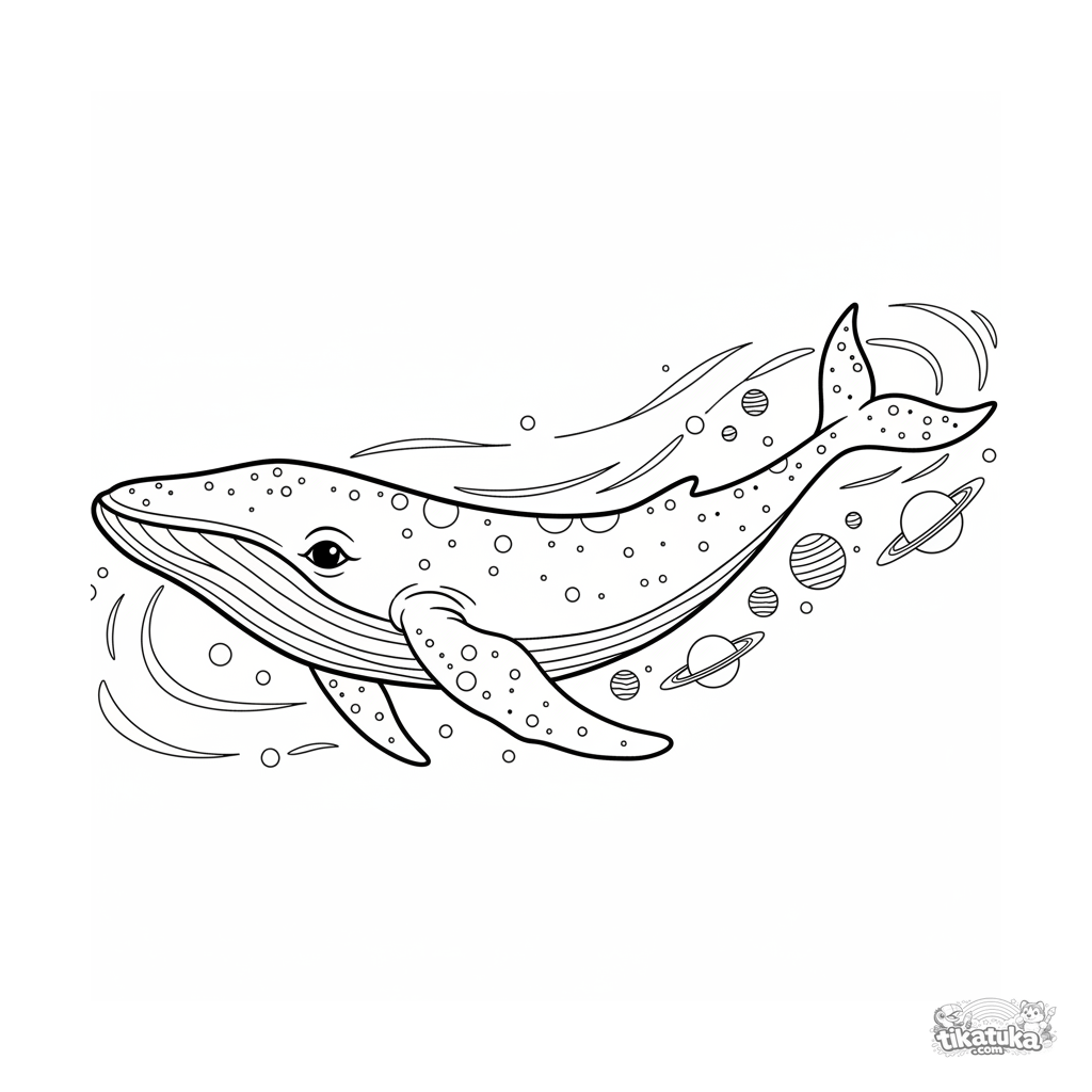 Detailed coloring page for older kids 10-12: a realistic cosmic whale swims through the outlines of a stellar nebula in outer space. Intricate line work, textures, and a rich cosmic backdrop.