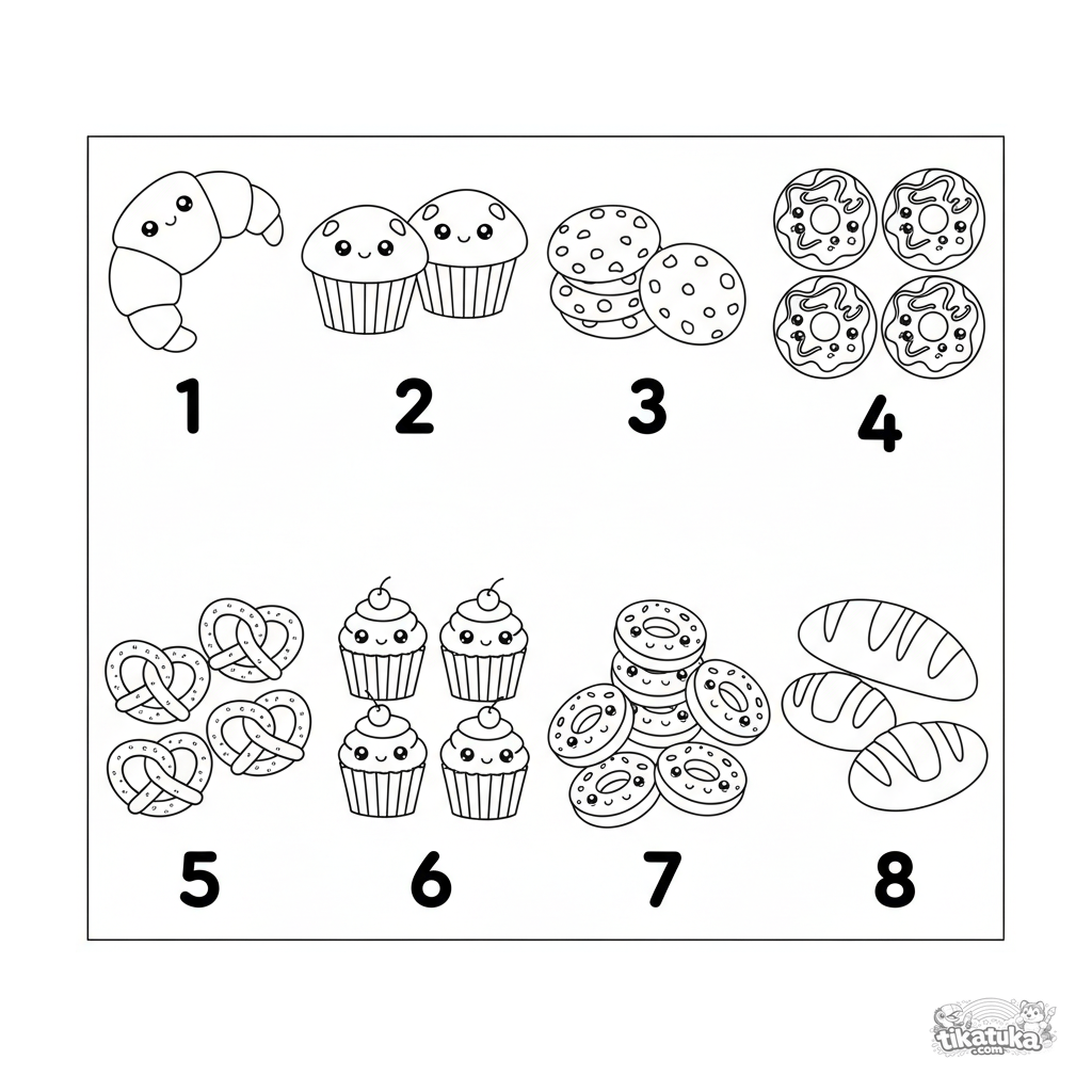 Educational sticker-sheet coloring page for toddlers 2-3: count from 1 to 8 different bakery items. Simple shapes, clear numbers, perfect for early counting lessons.