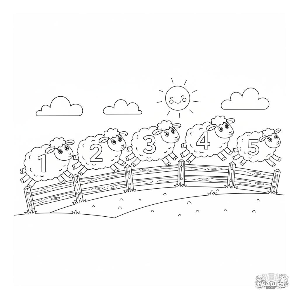 Educational coloring page for kids 4-6: five fluffy sheep with numbers jump over a fence. Helps learn number sequence from 1 to 5 in a fun, playful way.