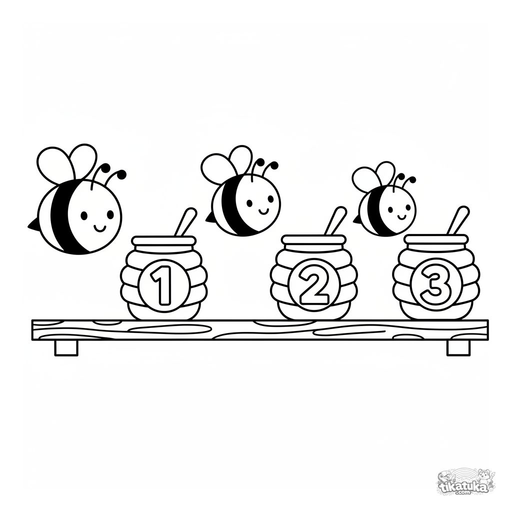 Educational coloring page for toddlers 2-3: three friendly bees and honey jars with numbers 1, 2, 3 for learning to count.