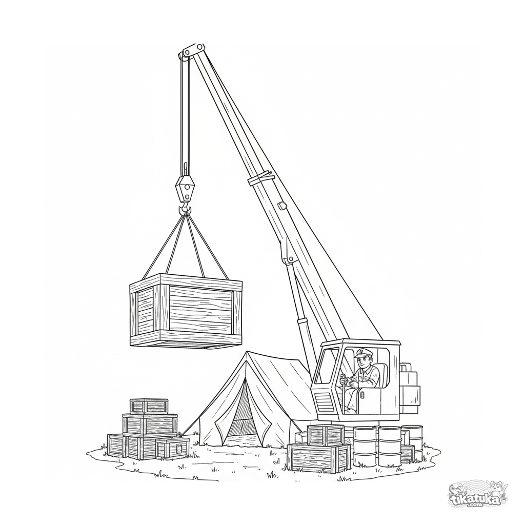 Coloring page for older kids 10-12: a detailed military crane loads supply crates near field headquarters tents.
