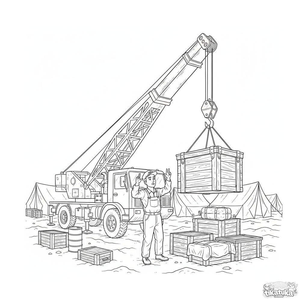 Coloring page for older kids 10-12: a detailed crane truck unloading supply crates at a field HQ. Realistic outlines and interesting technical details for engaged boys.