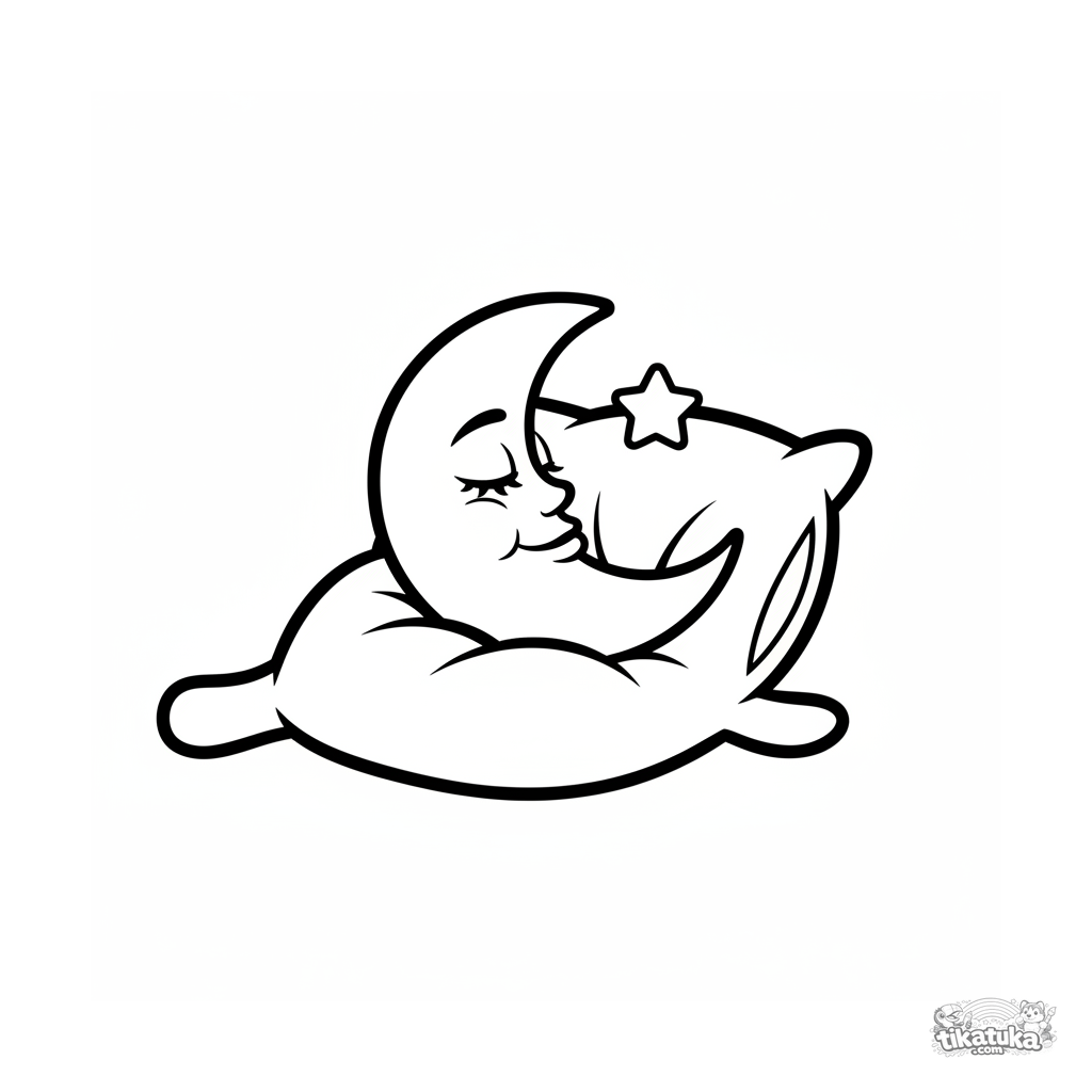 Toddler coloring page: a lulled crescent moon sleeps soundly on a soft cushion. Smooth curved lines and a calm theme are suitable for bedtime coloring.
