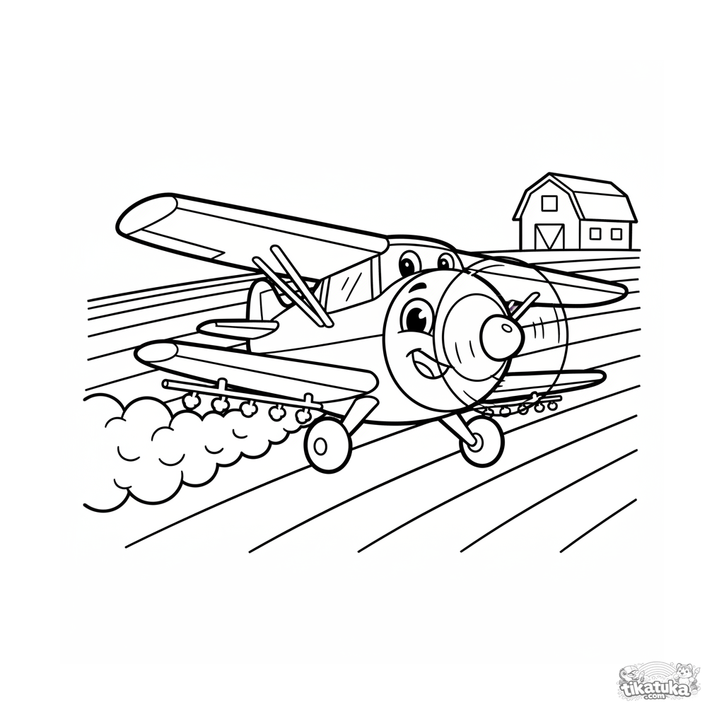Simple coloring page of a crop duster airplane flying low over a farm field. For toddlers (2-3 years old). Large shapes, airplane, field, and barn.
